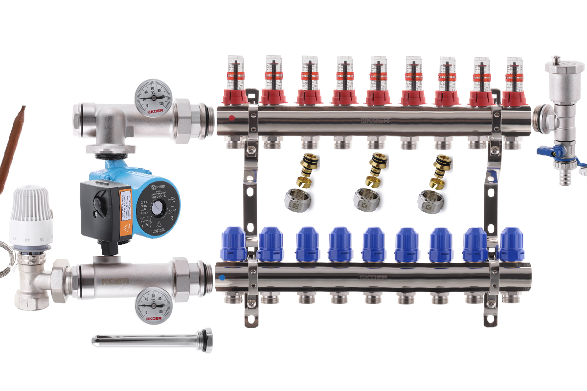 Колектор для теплої підлоги в складі на 9 контурів з насосом KOER